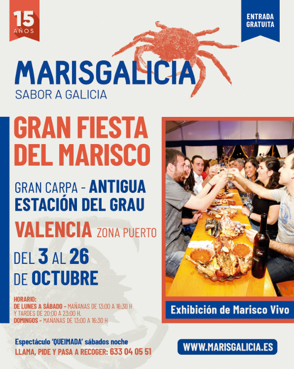 La gran fiesta del marisco vuelve un año más a la ciudad de Valencia con más fuerza y frescura que nunca. Desde el viernes 3 hasta el domingo 26 de octubre, MarisGalicia desplegará su gran carpa junto a la antigua Estación del Grao, un espacio de más de 1.500 m² transformado en un auténtico puerto gallego con capacidad para más de 1.000 personas, cocinas abiertas, barras, panadería, arrocería y un vivero donde elegir directamente los mariscos.